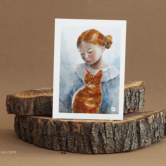 Картичка Котка - принт на авторска акварелна картина. Акварелен картон 300 гр.
